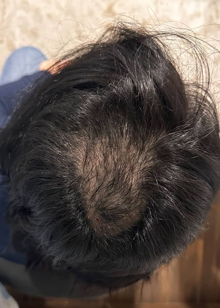 - Alopecia androgénica: Existen dos patrones de afectación, el masculino con pérdida de pelo localizada principalmente en las zonas frontal y parietal que se manifiesta inicialmente por el retraso progresivo de la línea de implantación anterior del pelo, lo que se conoce habitualmente como entradas, con afectación más tardía de la región del vértex o coronilla.