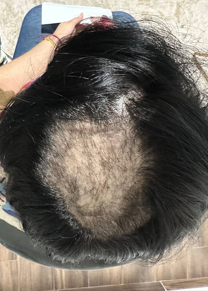 En el patrón femenino, la pérdida de cabello es difusa, no se producen zonas de calvicie total y queda respetada la línea de implantación anterior, es decir no existen entradas. - Alopecia areata: Es un tipo de caída del cabello que ocasiona parches redondos. Los folículos pilosos no quedan destruidos con esta enfermedad, por lo que el pelo puede volver a crecer, si bien es cierto que son muy frecuentes las recidivas o recaídas en pacientes que la han sufrido alguna vez.